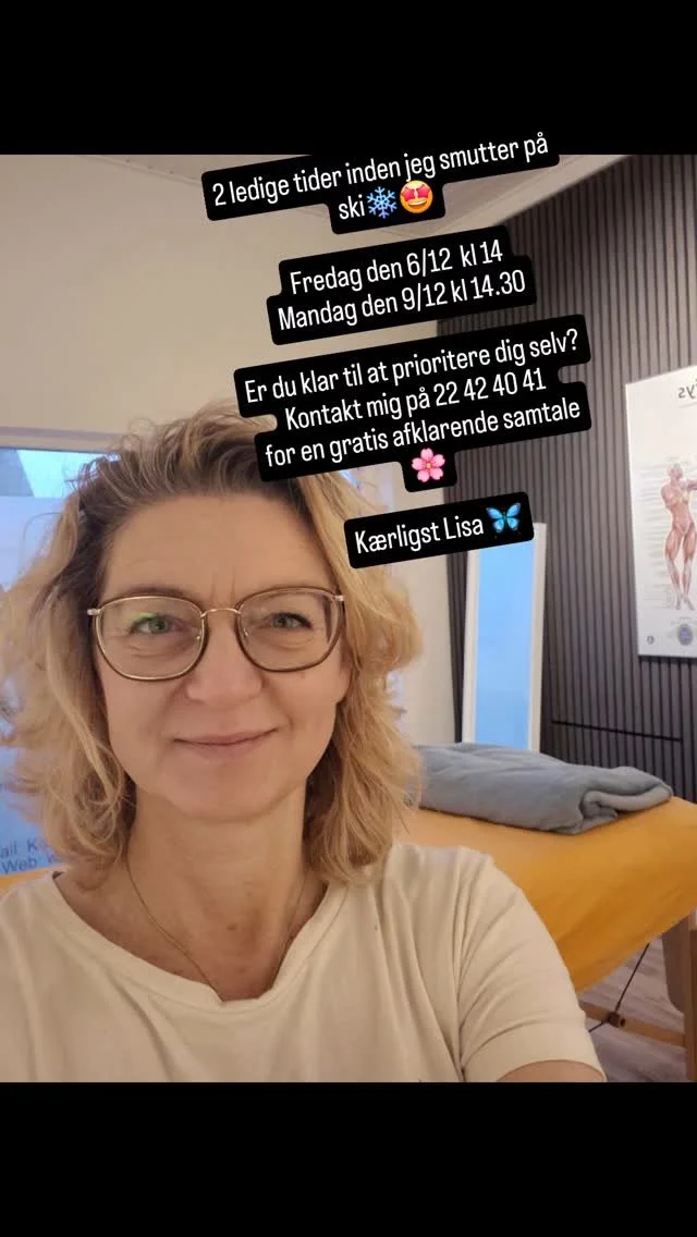“Jeg kom til Lisa med en krop, som næsten konstant var i alarm tilstand. Allerede ved første behandling, kunne jeg mærke at min krop gav slip og jeg fik mere tillid til min krop og dens behov. Det gjorde at jeg selv kunne stoppe noget af min alarm i krop og sind.”